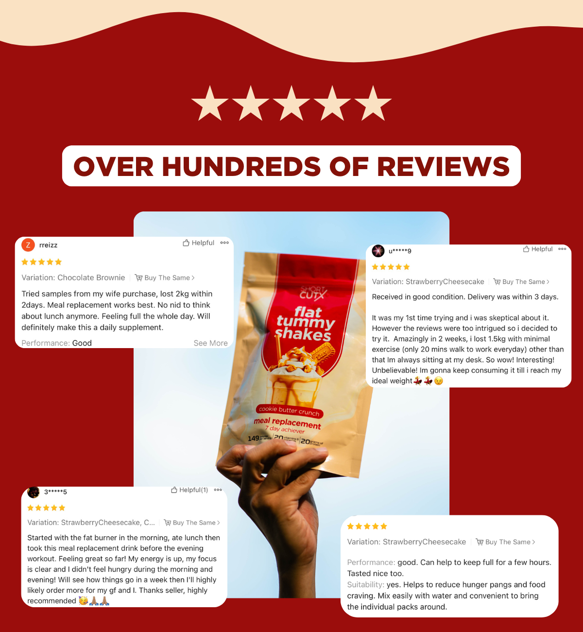 - +1seeing very good reviews so decided to try. so yeah! this was the difference!!! so happy that i order for 2wks supply again. hopefully to see more wts...Moreseeing very good reviews so decided to try. so yeah! this was the difference!!! so happy that i order for 2wks supply again. hopefully to see more wts dwn😁 took this in de mrg follow by meal replacement at night. no exercise only send kid go school via walking. the taste is SUPER NICE!! trying cheesecake next.. order yst, today received!!👍+1Received within 2 days, well packed. Exactly as per listing. Repeat purchase. Initially was very skeptical about this working, but after I tried out t...MoreReceived within 2 days, well packed. Exactly as per listing. Repeat purchase. Initially was very skeptical about this working, but after I tried out the first week (paired with the apple cider fat burner) and saw that I lost 1.5 kg, I had to buy it again! It’s really tasty (paired it with oatmilk since I don’t have almond milk) and does suppress my hunger. I honestly always look forward to having it for lunch/dinner! Highly recommend!All items received with all in order, there is no damage and individual pack is sealed accordingly. Repeated purchase few times from seller and produc...MoreAll items received with all in order, there is no damage and individual pack is sealed accordingly. Repeated purchase few times from seller and product seems to work well on curbing appetite. Currently doing basic workout to sweat out, not yet check my weight as it will be on monthly basis suprise result.😊😊😊+1Super fast shipping , amazing quality , I like it very much , highly recommend seller , five stars ratings .The food replacement offered is a convenient option for busy days. It's rich in nutrients and easy to prepare, serving as a quick meal substitute. Whi...MoreThe food replacement offered is a convenient option for busy days. It's rich in nutrients and easy to prepare, serving as a quick meal substitute. While it doesn't entirely replicate the taste of a full meal, its nutritional value compensates for it. It does suppress your appetite. I've noticed increased energy levels, better muscle recovery, and a more structured diet plan, contributing to my fitness goals.+1This is my first time trying this product so hopefully this will work on me✌🏼I bought for 1 month try and if does work on me will buy more of this nex...MoreThis is my first time trying this product so hopefully this will work on me✌🏼I bought for 1 month try and if does work on me will buy more of this next timeStarted with the fat burner in the morning, ate lunch then took this meal replacement drink before the evening workout. Feeling great so far! My energ...MoreStarted with the fat burner in the morning, ate lunch then took this meal replacement drink before the evening workout. Feeling great so far! My energy is up, my focus is clear and I didn't feel hungry during the morning and evening! Will see how things go in a week then I'll highly likely order more for my gf and I. Thanks seller, highly recommended 🥳🙏🏽🙏🏽Tried for 4 days, love the result. I drink Cider juice in the morning and replaced dinner with the shake.. love the shake, it's easy and convi as pack...MoreTried for 4 days, love the result. I drink Cider juice in the morning and replaced dinner with the shake.. love the shake, it's easy and convi as package..so tasty too! Keep me full and no cravings, will update the result after tried for few week. Thank you seller for fast shipment!Received well. Instructions clearly indicated on the box. The shake meal replacement tasted awesome. Hoping to see weight loss after 30days.Just received. Have not tried. Just thought it's a good packaging. Suitable for busy people who wants to maintain and lose weight. No need to measure ...MoreJust received. Have not tried. Just thought it's a good packaging. Suitable for busy people who wants to maintain and lose weight. No need to measure serving as pre-packHave been taking Apple Cider Vinegar for 6 months. Effective for me and my husband. Took longer time to slim down. From 58kg to 52kgFinally bought these after much contemplation. Had it with full cream milk. Really delicious and hopefully this will suffice for me to last til breakf...MoreFinally bought these after much contemplation. Had it with full cream milk. Really delicious and hopefully this will suffice for me to last til breakfast.All items received with all in order, delivery was fast. Will come back again to purchase anything if needed. Thank you seller for the great deal.🙏🙏👍👍